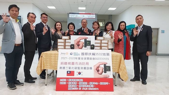 桃園朝陽扶輪社社長劉美含女士結合7個協辦社(桃園東南、向陽、新橋、中山、成功、和平及韓國D3590 RC Jinju Mindeulre等扶輪社),向國際扶輪社全球獎助金爭取補助捐贈20組二氧化碳監測儀予桃園市政府消防局,捐贈典禮30日上午10時假消防局(桃園市桃園區力行路280號)舉行,由謝呂泉局長接受,並回贈感謝狀。扶輪社成員們平時樂善好施、熱心公益,本著「取之社會、用之社會」的理念,利用工作之餘從事公益,不僅提供社會各角落物資及資金的援助,更為民眾生命財產貢獻一份心力。