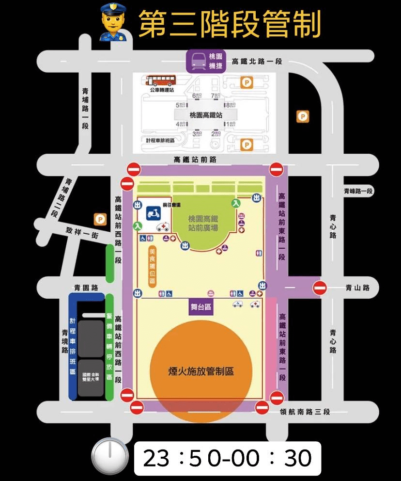 因應跨年晚會湧入之龐大人潮及車流,市府制定交通管制及疏運措施,並加強各項交通管制措施之宣導,自行駕車、騎車者周邊也有規畫停車位,請駕駛人提早前往並妥善停車,另為維護交通順暢及確保民眾安全,會場周邊實施三階段管制,詳細資訊如下: