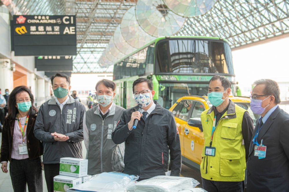 桃園市長鄭文燦3日上午前往桃園機場第二航廈,視察桃園市防疫車隊運作情形。鄭市長表示,春節年假將近,多元居家檢疫方案已進入高峰期,面對Omicron病毒株的挑戰,防疫車輛需求大幅提高,桃園除擴編防疫計程車車隊由534輛增至982輛外,也籌組10輛防疫巴士,負責運送本市防疫旅館中設籍苗栗以南縣市的返家檢疫者,市府將以最嚴謹的SOP及徹底的清消作業,防堵所有飛沫傳染及接觸感染的可能性。鄭市長今除致贈防護衣、N95口罩等防疫物資外,也感謝防疫車隊這兩年於防疫工作上的付出,成功守住國門第一線,未來市府將持續給予防疫車隊更大的支持。