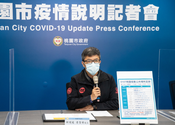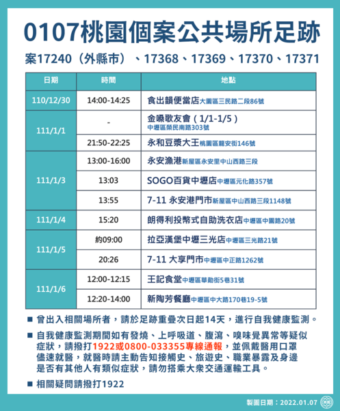 中央流行疫情指揮中心7日公布桃園新增4例本土、6例境外個案,桃園市政府下午召開疫情說明記者會。新聞處長詹賀舜表示,有關案17240(外縣市)、17368、17369、17370、17371公共場所足跡,於110年12月30日曾出入食出韻便當店;111年1月1日曾出入金嗓歌友會(1月1日至1月5日)、永和豆漿大王;1月3日出入永安漁港、SOGO百貨中壢店、7-11永安港門市;1月4日出入朗得利投幣式自助洗衣店;1月5日出入拉亞漢堡中壢三光店、7-11大享門市;1月6日出入王記食堂、新陶芳餐廳,若民眾曾出入相關場所,請於足跡重疊次日起14天,進行自我健康監測,監測期間如有發燒、上呼吸道、腹瀉、嗅味覺異常等疑似症狀,可撥打1922或0800-033355專線,由衛生局同仁提供相關諮詢。