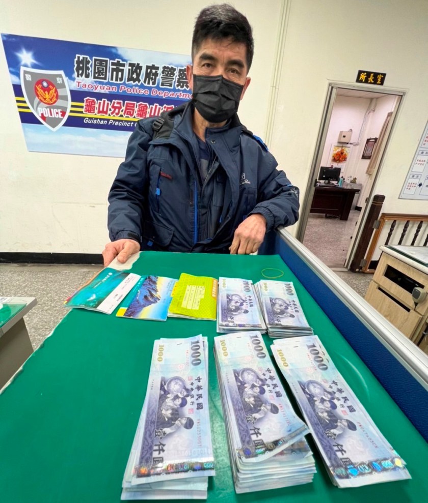 龜山派出所員警白承平、劉鴻儒9日擔服巡邏勤務,於19時26分許接獲陳姓民眾(58歲)報案在龜山區萬壽路二段458號前車道、安全島及路邊草叢中到處有千元大鈔正隨著寒風漫天飛舞,而報案人正於車陣中撿拾險象環生,員警見狀連忙下車協助,另考量天色昏暗且時逢尖峰時刻車流量大,為維護交通順暢及其他用路人安全,即時通報線上員警曹惟智、梁尊翔前來協助,經由4名員警、民眾通力合作,耗時數十分鐘後於現場共拾獲千元鈔現金共計新台幣13萬8000元,以及郵局、玉山銀行等存摺。