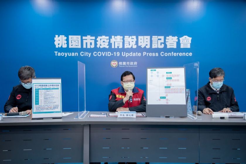中央流行疫情指揮中心(13)日公布桃園新增13例本土及3例境外移入病例,桃園市政府於下午召開疫情說明記者會。桃園市長鄭文燦表示,中壢聯邦銀行健行分行群聚感染事件,目前累計有13位員工及1位家人,共14位確診。經疫調顯示,居服員案17472於1月4日曾至該行開戶,停留時間約55分鐘,其確診後,負責接待的銀行員工(案17630)列為自主健康管理,因有疑似症狀,於快篩及安排採檢後確診。由於聯邦銀行健行分行有群聚感染風檢,經疫調匡列,行員家人59位,及其餘檢驗呈陰性的行員17位,昨日共計76位已送至集中檢疫所進行隔離,期盼減少社區感染風險,建立社區安全防線。