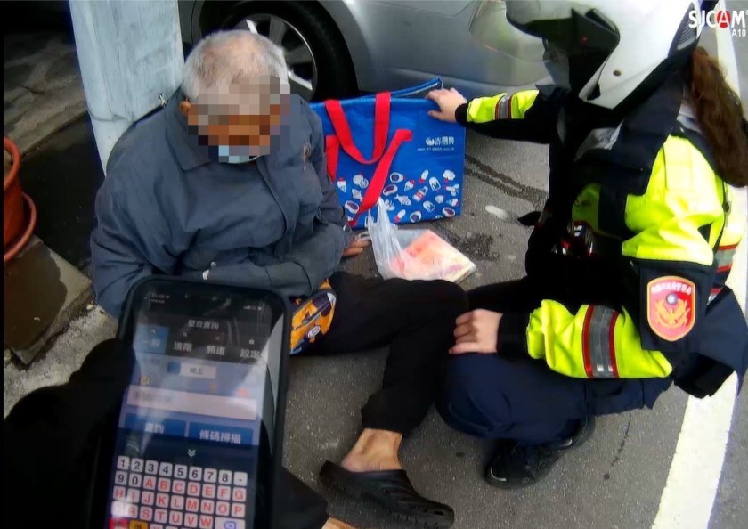 恰巧員警潘柔涵及劉育安巡邏經過,見老翁臉色慘白癱坐在路旁,員警趕緊上前關切,發現老翁臉色發白,疑似體力不支,且說起話來有氣無力,語意完全無法表達,員警只好先將老翁帶回駐所稍作休息,並提供熱飲及熟食供老翁補充體力。