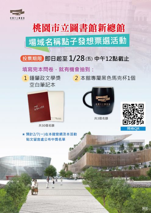 桃園市立圖書館新總館場域名稱點子發想票選活動已於本館官網及臉書粉絲專頁開跑!即日起至1/28(五)填寫問卷連結,就有機會抽到精美好禮。本次活動開放3個場域給民眾票選,也歡迎民眾提供更棒的點子發想,得票最高的名稱及創意名稱,將列入命名參考,趕快一起腦力激盪吧,很可能桃市圖未來確定的場域名稱,就是你想的唷!