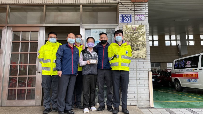 桃園市一名50歲葉姓民眾,110年11月27日聚餐後搭火車回家,在車站月台突然倒地不起,現場車站員工見狀趕快打119並施以CPR(心肺復甦術),直到救護人員接手CPR再給予AED(自動電擊器)後緊急送醫,幸好當時及時發現,才得以救回民眾寶貴性命,年關將至,葉先生今天特別到富岡消防分隊感謝出勤人員,感動地說:「謝謝富岡消防隊,讓我重獲新生。」致贈分隊感謝獎牌留念,葉先生特別致贈分隊獎勵金慰勞弟兄,富岡分隊長婉拒,心領的說:「謝謝葉先生,民眾的安全就是我們的責任,很高興葉先生可以健康出院。」