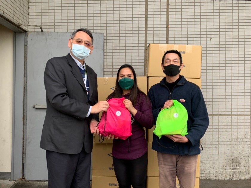 桃竹苗分署長賴家仁(左)致贈關懷包給配合隔離檢疫的鴻佰等企業的121名外籍移工。