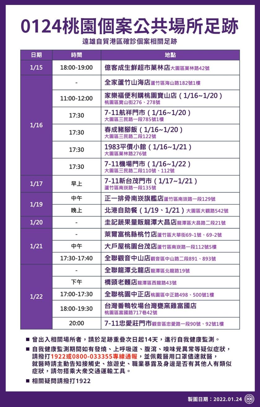 新聞處長詹賀舜表示,,市府針對遠雄自貿港區個案公共場所足跡,將以每日公布兩次的方式即時提供資訊,也請市民朋友提高社區防疫意識。今(24)日上午公布遠雄自貿港區個案1月15至22日相關公共場所足跡,包括1月15日晚間至億客成生鮮超市菓林店;1月16日至全家超商蘆竹山海店;1月16至20日中午至家樂福便利購桃園寶山店、傍晚至7-11航祥門市、春成豬腳飯;1月16至21日傍晚至1983平價小館;1月16至22日傍晚至7-11機場門市;1月17至21日早上至7-11新台茂門市;1月19日中午至正一排骨南崁店;1月19日及21日晚上至北港自助餐;1月20日至圭記蔬果量販龍潭大昌店。