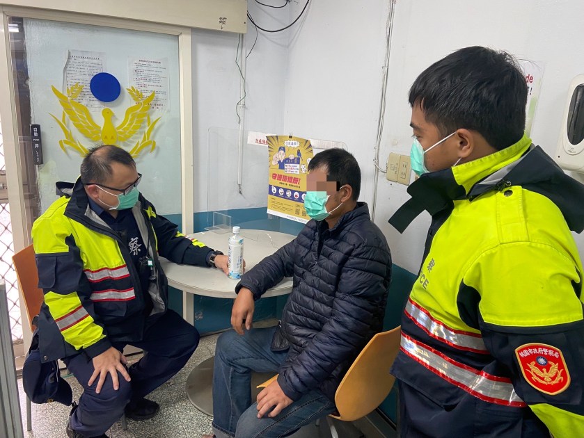 楊梅警分局埔頂派出所員警24日中午巡邏時,發現一男子未戴口罩,全身溼透蹲坐路旁,員警上前規勸盤查時發現該男子為失蹤人口,立即將他帶回派出所並通知男子家人,讓他在春節前夕能夠與家人團聚,家屬對警方的協助深表感謝。