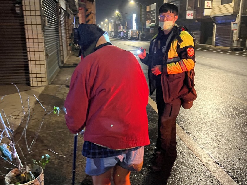 失智翁穿著短褲深夜在外遊蕩,楊梅分局員警發現後將他帶回派出所,查詢出身分後協助將老翁送返家。