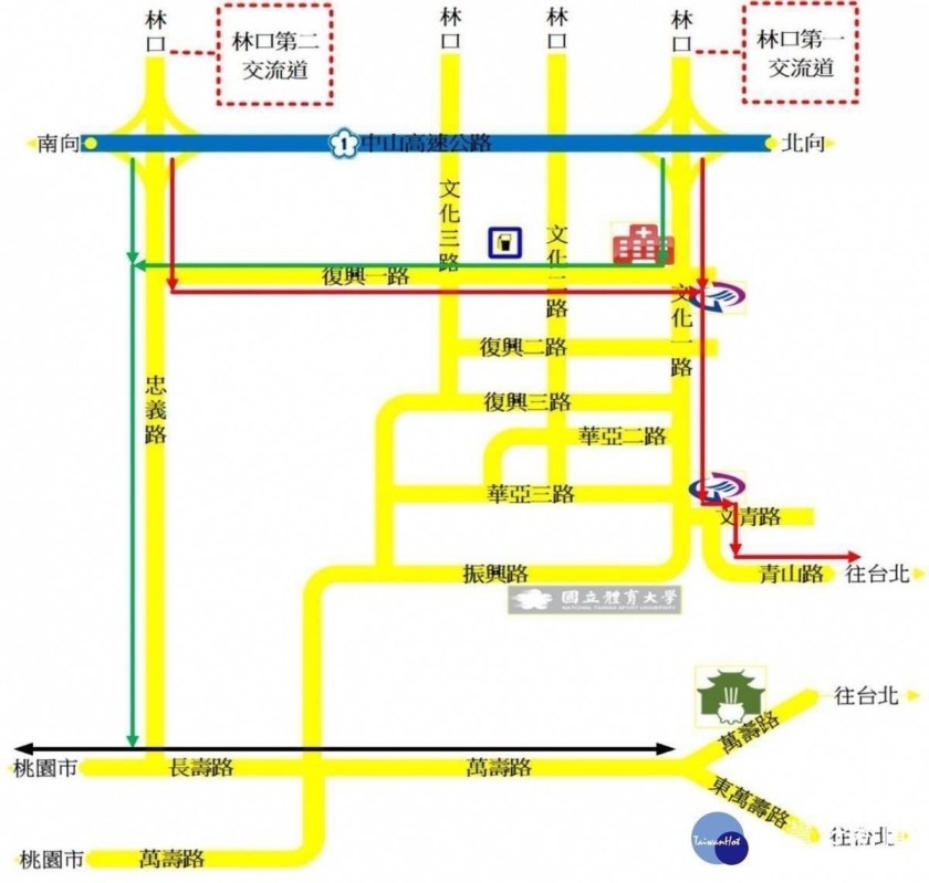 (二)林口2交流道:龜山區忠義路三段→左轉復興一路→右轉文化一路→左轉文青路→右轉青山路往新北市新莊區北上。