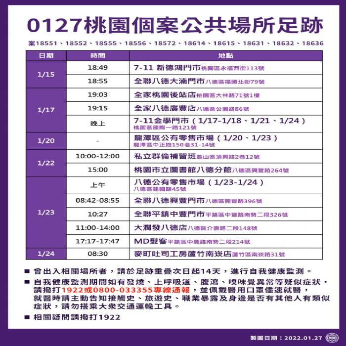 詹處長表示,案18551、18552、18555、18556、18572、18614、18615、18631、18632、18636公共場所足跡包含:1月15日晚間曾至7-11新德鴻門市、全聯八德大湳門市;1月17日晚間曾至全家桃園後站店、全家八德廣豐店;1月17日、18日、21日及24日晚間曾至7-11金學門市;1月20日及23日曾至龍潭區公有零售市場;1月22日上午曾至私立群倫補習班、下午曾至桃園市立圖書館八德分館;1月23日及24日上午曾至八德公有零售市場;1月23日上午曾至全聯八德興豐門市、全聯平鎮中豐門市、大潤發八德店、MD髮客;1月24日上午曾至麥町吐司工房蘆竹南崁店。