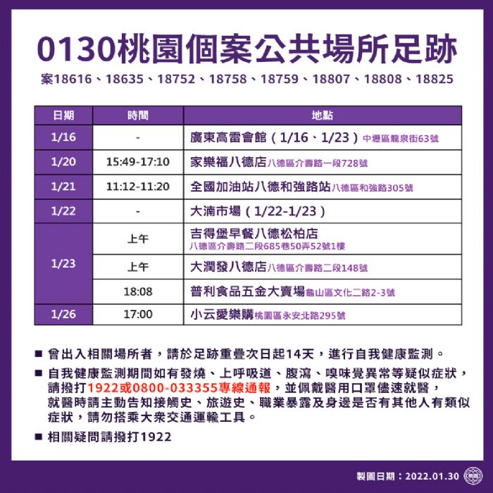 詹處長進一步說明,相關公共場所足跡包含:1月16日及23日至中壢區龍泉街「廣東高雷會館」;1月20日下午至「家樂福八德店」;1月21日上午至「全國加油站八德和強路站」;1月22日及23日至「大湳市場」;1月23日上午至八德區介壽路「吉得堡早餐八德松柏店」、「大潤發八德店」、下午至龜山區文化二路「普利食品五金大賣場」;1月26日下午至桃園區永安北路「小云愛樂購」。