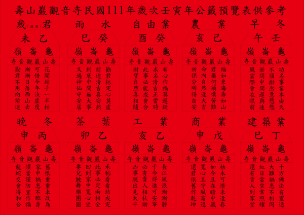 壽山巖觀音寺於二月三日(農曆初三)舉行壬寅年抽公籤儀式,由董事長林正峰抽出國運籤為六十甲子籤的「乙末籤」,籤詩為「花開結子一半枯、可惜今年汝虛度、漸漸日落西山去、勸君不用向前途」。嘉義新港奉天宮於二月四日(農曆初四)抽出的國運籤,與壽山巖觀音寺屬同一支「乙未籤」,是巧合還是天機?