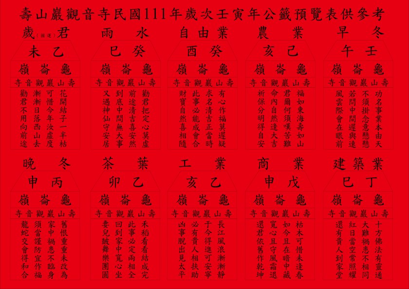 壽山巖觀音寺於二月三日(農曆初三)舉行壬寅年抽公籤儀式,由董事長林正峰抽出國運籤為六十甲子籤的「乙末籤」,籤詩為「花開結子一半枯、可惜今年汝虛度、漸漸日落西山去、勸君不用向前途」。嘉義新港奉天宮於二月四日(農曆初四)抽出的國運籤,與壽山巖觀音寺屬同一支「乙未籤」,是巧合還是天機?