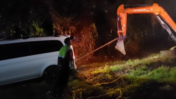 警方靈機一動徵調於山區施作工程小型挖土機前來救援,經承包工程老闆同意後,2名工人也隨即將怪手運抵現場以鋼索連結拖拉方式,花費近4小時才幫助遊客脫困,孫民一家人再三感謝警方協助。