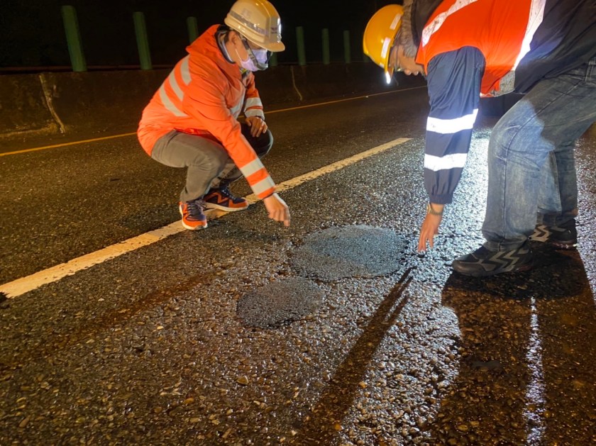 民眾反應台61路面坑洞情形,因天候持續降雨,無法採用刨除重鋪方式辦理改善,故自21日起,每日工程人員即冒雨採用高性能瀝鎂土臨時填補,為避免跳料問題,自22日起,夜間採取局部封路措施,由工務段段長率隊進行各破損處填補並採用鐵輪滾壓機加強夯實避免脫落。對於路面品質不佳深感抱歉,爾後將加強預防性養護修復,在路面龜裂時即辦理方正刨除修復作業,避免連續降雨時形成坑洞,又因瀝青鋪設需在路面乾燥情況下方得施工,僅能緊急填補,造成「填補-跳料-坑洞」的惡性循環。