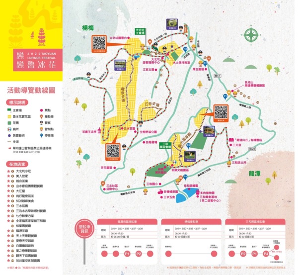 對於龍潭區三水里大北坑魯冰花觀賞區,因人潮眾多,將採單循環方式管制,請汽機車交通工具遵行單向通行,沿路均不提供停車位,欲停車請將車輛停放至會場規劃停車場;另有提供接駁車服務,民眾可搭乘公路客運至龍潭區龍潭運動公園或楊梅區的楊梅火車站後站(金德路與成德二街交叉路口),即可接駁車前往會場。