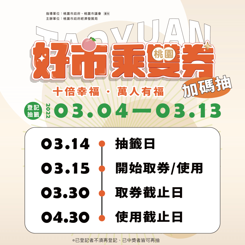「桃園好市乘雙券加碼」活動於4日上午9點開放登記,至3月13日23:59截止,已登錄民眾(含已中獎者)皆可免登記再繼續抽,提醒之前來不及登記且還持有200元五倍券的民眾,記得把握時間上活動官網登記(https://taoyuandoublepon.tycg.gov.tw),預定3月14日進行抽籤。