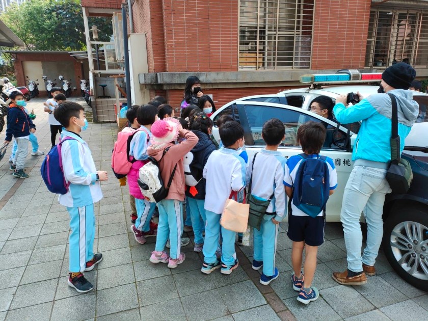 龜山區長庚國小三年級師生約110人校外教學參訪英勇的波麗士工作環境,警察大姊姊、大哥哥為此精心準備指揮棒、反光背心、警用汽機車、防彈衣、無線電、警用裝備及留置室讓小小主人翁親身體驗,學童變成好奇寶寶不斷提問讓解說員警頓時招架不住。