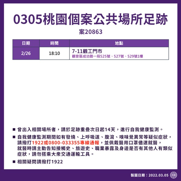 新聞處長詹賀舜公布個案20863之公共場所足跡,2月26日18時10分至7-11觀工門市(桃園市觀音區成功路一段525號)。