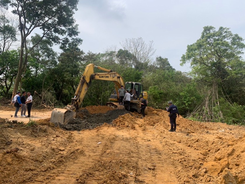 龍潭警分局高平派出所巡佐蕭漢祥及警員卓光煜等2員,考量該處山坡地如遭人傾倒廢棄土,將影響山坡地水土環境,漏夜調閱轄區天羅地網,租賃式及民間裝設監視系統積極偵辦,另針對該山坡地附近規劃巡邏警網及便衣埋守勤務,加強山區巡守稽查,法網恢恢疏而不漏,經便衣埋守員警於17日下午,發現該處有大型挖土機及砂石車進入,隨即通報線上巡邏警網趕赴現場。