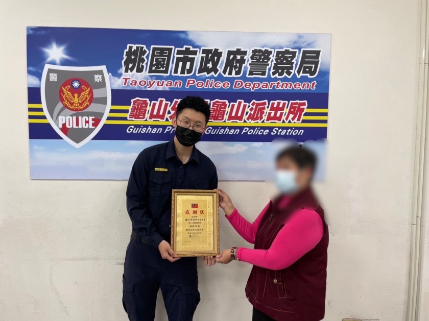 龜山區65歲陳姓婦人擔任清潔工以機車代步,日前機車遭竊向龜山派出所報案,員警四小時內在新北市鶯歌區找到失竊機車及查獲呂姓男子涉案函送法辦,19日上午陳婦至派出所致贈感謝狀由副所長孫若倫代表受贈,陳婦表示機車是她重要的上班交通工具,知道警察不能隨便收受禮物,所以送感謝狀來表達感謝波麗士大人維護治安的效率。