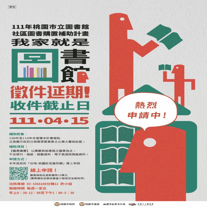 「111年桃園市立圖書館社區圖書購置補助計畫」收件日期延期至111年4月15日止!桃園市立圖書館原定於1月17日至3月22日辦理社區購書補助計畫收件,惟自申請期程開跑,民眾詢問電話熱度不斷,考量為使社區民眾有更充足申請作業時間,決定延長申請時間延至4月15日,歡迎未曾獲本計畫補助之桃園市政府立案管理委員會之公寓大廈或社區踴躍申請,建置社區藏書風格與閱覽空間,打造「我家就是圖書館」。