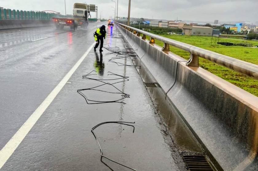 台61線快速道路北上桃園竹圍路段,28日清晨出現數條鋼筋散落在路面,影響交通安全,大園分局竹圍派出所獲報後立即前往疏導交通、排除障礙,維護用路人安全。