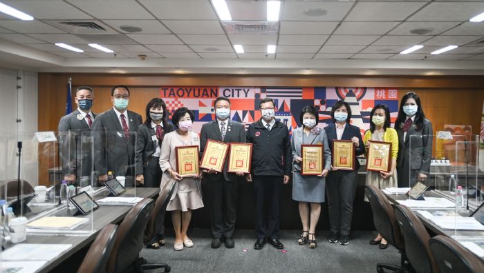 鄭文燦頒發感謝狀,感謝「國際扶輪3501地區」與太子駕訓班共同捐贈中壢龍岡大型採檢站;「國際扶輪3502地區」捐贈八德陽光活力園區大型採檢站及9座移動式正壓採檢亭;「國際獅子會300G2區」捐贈中路採檢站;「財團法人明基文教基金會」捐贈1座社區篩檢站及3座正壓採檢亭、「禾聯碩股份有限公司」捐贈10台芬多殺菌變頻空調及8台抑菌王DC風扇。