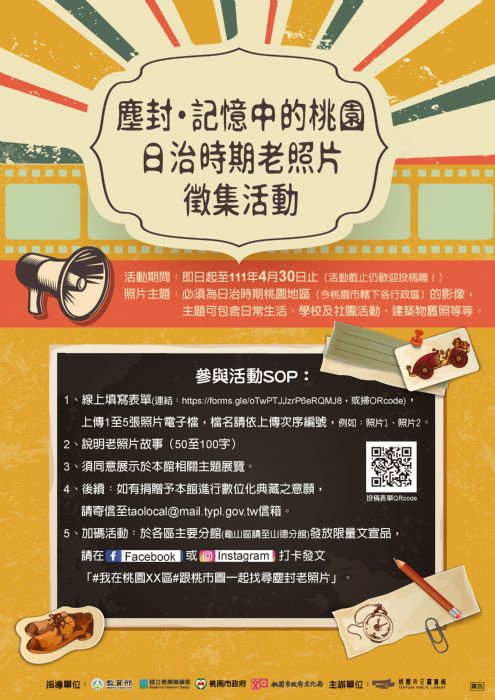 您知道日治時期的桃園地區,曾有過多少精彩的歲月嗎?桃園市立圖書館即日起至4/30日止,徵集日治時期的桃園老照片影像檔,讀者可前往各分館取得相關資訊,並線上填寫表單,分享影像背後的故事。此外,讀者也可至各區主要分館,透過Facebook、Instagram打卡,一起與桃園市立圖書館尋找塵封的在地記憶。