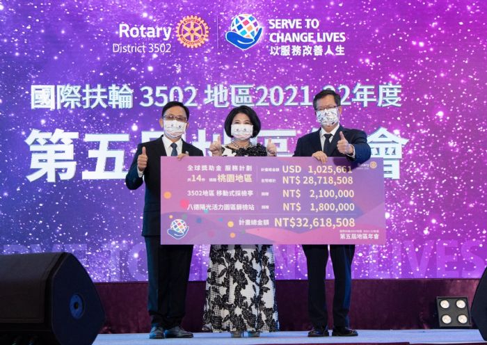 此外,國際扶輪3502地區共20件全球獎助金計畫提案通過,預算規模達210萬美元,其中桃園共14件,包含:桃園東信社「心燈牙科室設備更新計畫」、大園社「青溪國中與新住民共學計畫」、桃園朝陽社「桃園消防局南區消防分隊潮氣末二氧化碳監測儀需求計畫」、桃園圓夢社「桃園市築夢培力農作園區圓夢計畫」、大溪中央社「大溪中庄新農園區孵化計畫」、桃園福臻社「新住民子女終身學習計畫-技能在手,夢想飛Young」等。