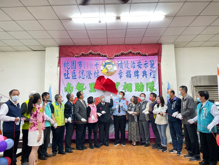 為強化社區治安營造執行力,建立多元合作夥伴關係,桃園市政府警察局18日特別舉辦桃園市「績優治安示範社區」揭牌儀式,平鎮區南勢里獲選桃園市110年績優治安示範社區,桃園市副市長高安邦特別代表市長鄭文燦出席頒發認證標章,並感謝所有守望相助隊成員不辭辛勞的付出,讓社區的治安越來越好。