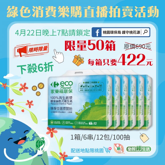 另外,環保局首創綠色消費樂購「直播拍賣」活動,於4月22日「地球日」當天晚上7時,結合「桃園環保局 護守桃花源」FB粉絲團,進行線上直播拍賣促銷,原價690元的環保衛生紙,下殺6折,每箱只要愛地球價「422元」,限量50箱,歡迎民眾於直播期間鎖定關注護守桃花源粉絲團(備註:配送地點必須在桃園市轄內)。
