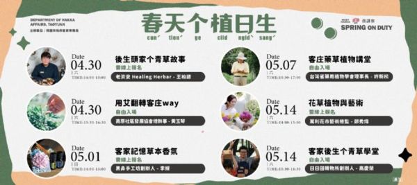 客家局表示,為了讓大小朋友更喜歡客家,今年選擇以「客家藥草植物」、「客家山茶文化」、「客語童謠繪本」及「客家流行音樂」4大貼近日常生活的主題,各規劃6場主題系列講座及體驗活動,結合多元面向讓民眾更深入了解客家文化,透過五感體驗與自然連結,尋找當代客家新生活,更多活動詳情請搜尋客家事務局臉書粉絲專頁查詢(https://www.facebook.com/tychakka/)。