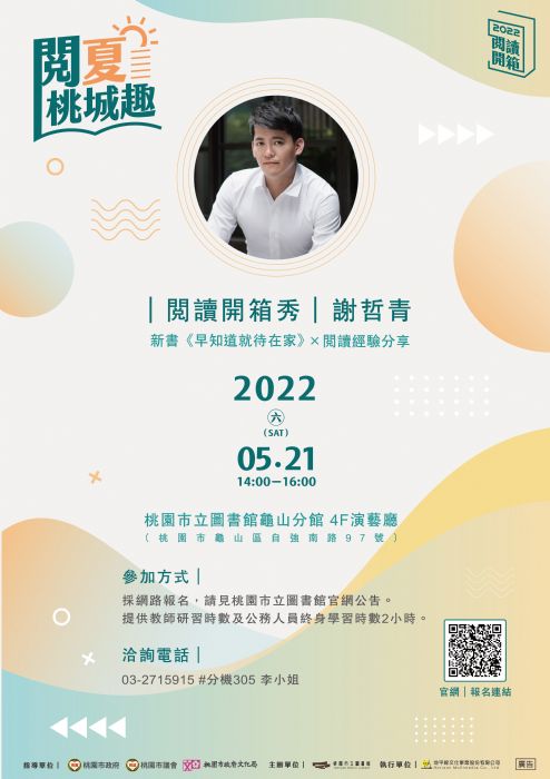 5月21日「閱讀開箱秀」活動現場開放QA問答,還有限量精美小禮物與抽獎活動!並提供公務人員終身學習時數及教師研習時數2小時,喜歡謝哲青與愛書的讀者們千萬不能錯過!歡迎大家一起來共襄盛舉。報名活動詳情請洽桃園市立圖書館官網:https://reurl.cc/1ZgqL9 或臉書訊息,或電洽(03)2715915分機305李小姐。