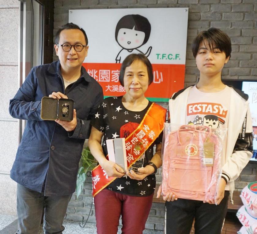 家扶基金會全國自強母親陳美琦女士(中)與兒子接受桃園家扶中心張伏杉主任(左)表揚合影