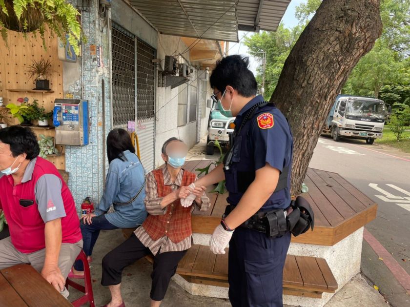 所幸宋屋派出所同仁警員吳曉玲及盧冠維巡邏經過,一眼就發現坐在長凳上的老婦人神情有異,立即停車上前關心,但由於老婦人體力透支,說起話來有氣無力,面對員警詢問完全無法清楚表達語意,於是員警趕緊扶老婦人到陰涼處休息,並提供飲水及食物供老婦人恢復體力。