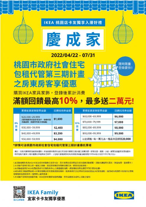 桃園市政府住宅發展處與IKEA宜家家居攜手合作,即日起至111年7月31日止,凡是參加桃園市政府社會住宅包租代管第三期計畫之房東房客,租賃契約有效期涵蓋購物回饋活動期間(111年4月22日至7月31日),在IKEA宜家宜居桃園店購買家具家飾商品「累計」消費金額達2萬以上者(不含服務費及運費),即可享有購物回饋,最高享有10%回饋2萬元。