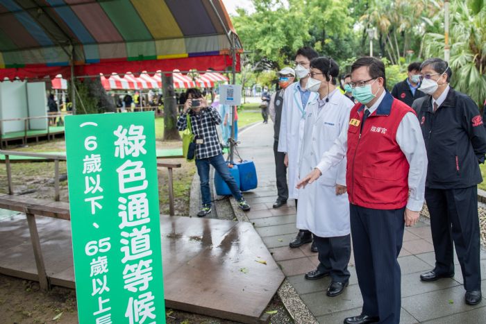 桃園市長鄭文燦17日上午前往中壢區中正公園,視察「長者、幼兒PCR三合一綠色通道」運作情形。鄭市長表示,桃園9處社區採檢站今日起全面設置「長者、幼兒PCR三合一綠色通道」,並擴大服務年齡至6歲以下幼兒及65歲以上長者,提供「PCR採檢、醫生看診、拿藥」的三合一服務,陪同採檢的照顧者亦可同時領藥,讓民眾在最短時間內取得緩解藥物,同時減少醫療院所的壓力。