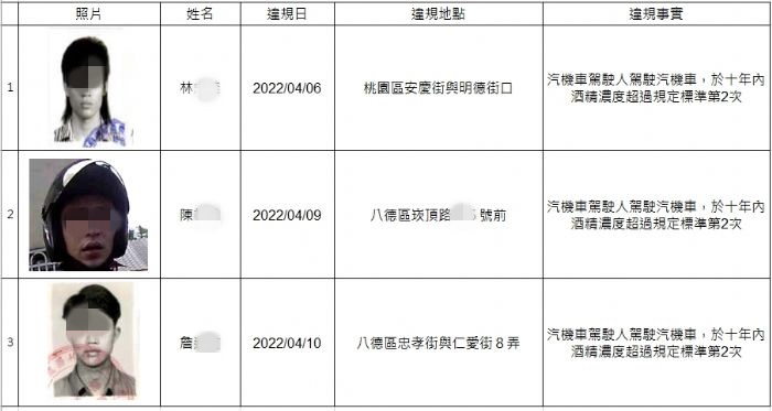 本次公告的酒駕累犯名單有3位,1位於桃園區違規酒駕被攔查;另2位則是在八德區有違規酒駕情形,3位都是累犯;截至目前計公布5名累犯名單,分別在5月9日公布2位、5月17日公布3位。