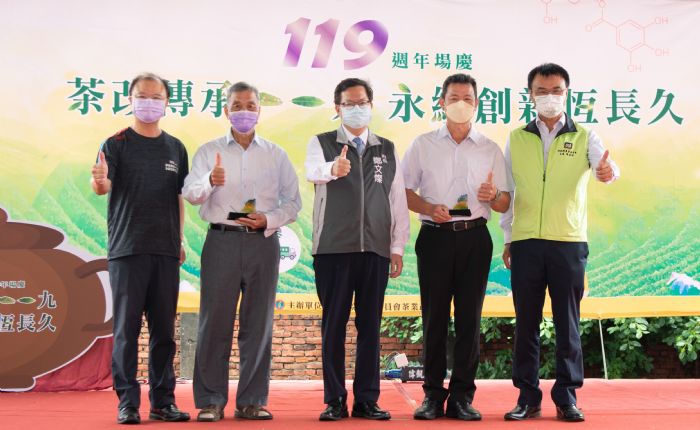 茶業改良場場長蘇宗振表示,茶業改良場在台灣茶業歷史扮演重要角色,以今(111)年119週年場慶伴手禮為例,其中有魚池分場日月潭紅茶、台東分場原生山茶及文山分場包種茶,分別代表台灣茶的三個產區,另外還有茶球、小香包及茶杯,代表循環農業及淨零排放的象徵。他也期盼能將製茶工藝推廣到全世界,經由創新讓茶元素能廣泛應用在日常生活中。此外,為因應產業變遷,茶改場也將發展草本作物及咖啡種植,規劃下一個百年的台灣茶產業。