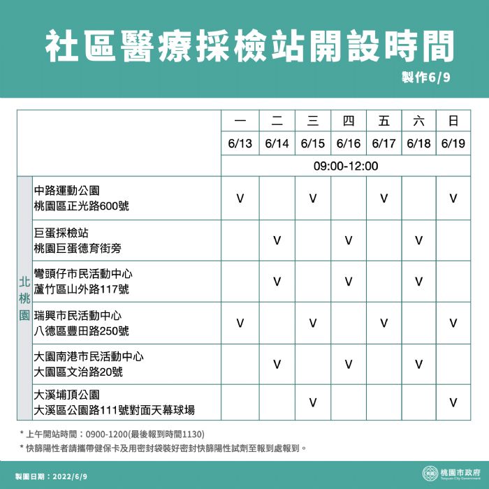 王局長表示,隨著疫情趨緩,桃園社區醫療採檢站使用人數已大幅降低,昨(11)日桃園市社區醫療採檢站的看診人數降至437人、PCR採檢人數共490人,為調節醫護團隊量能,市府規劃自6月13日起,保留11處社區醫療採檢站,以每天維持開設5至6站的方式,於上午9時至12時提供服務,詳細資訊可至市府衛生局網站或「桃園市政府防疫資訊網」(網址:https://covid-19.tycg.gov.tw/)查詢。