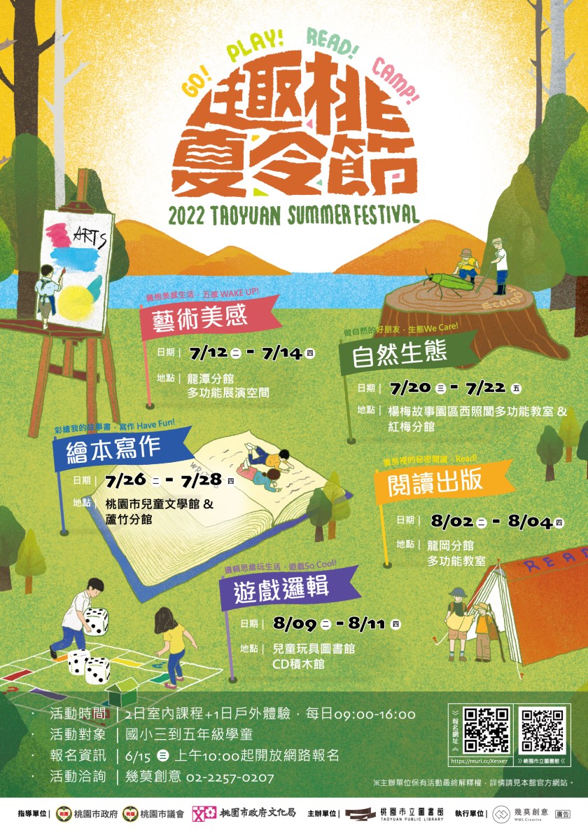 除新總館圖書搬遷之外,市立圖書館於暑期首度舉辦「趣桃夏令節」閱讀營隊,針對國小三到六年級的學童量身打造出5系列夏令營,提供5間特色圖書館的多元五感學習場域,包含藝術美感、自然生態營、繪本寫作、閱讀出版及邏輯遊戲等,規劃專業講課、館舍導覽及參訪行程,充實的營隊內容將於6月15日上午10時開放報名,歡迎有興趣的國小孩童都能參與體驗全新的圖書館知識之旅。