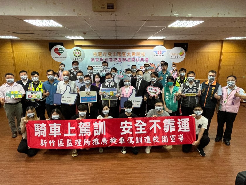 新竹區監理所今(111)年為積極響應機車駕訓進校園政策,目前在桃園市已與9所高中職及大專院校合作,13日假萬能科技大學辦理機車駕訓進校園聯合開訓典禮,交通部道安委員會黃運貴執行秘書、桃園市鄭文燦市長、交通局劉慶豐局長、教育局高玉姿副局長等及公路總局林義勝副總工程司均蒞臨指導,現場除致贈學員安全帽,並由9所學校進行插旗聯署活動,同時請太子駕訓班專業講師說明機車考照上駕訓班之學術科教學內容,與會貴賓與校長都肯定這場活動的意義。
