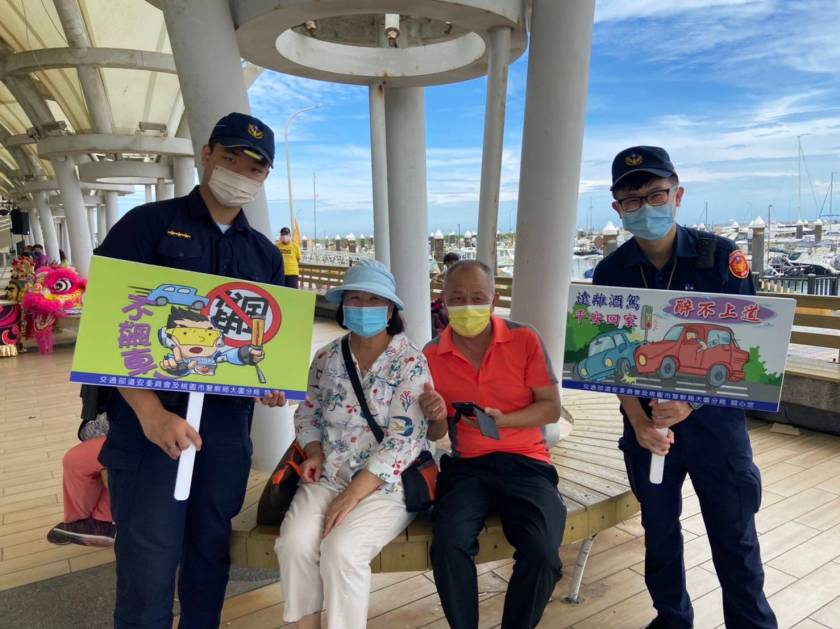 桃園市政府警察局大園分局為提升民眾交通安全意識,13日結合竹圍漁港內「2022港口文化海巡季活動」,利用人潮聚集的機會派員上街宣導,藉由傳達民眾正確的知識,了解「路口慢看停、行人停看聽」的重要,降低交通事故發生率。