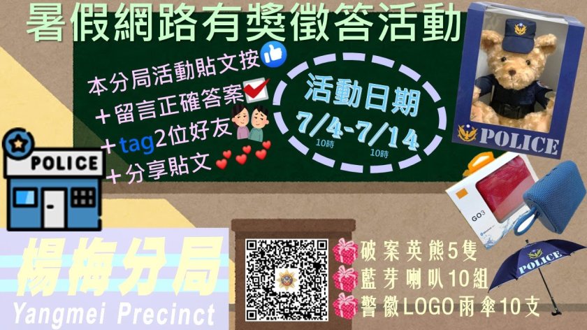 暑假已在萬眾期待下正式開始,桃園市政府警察局楊梅分局在暑假期間以防制青少年「接觸新興毒品」、「參與詐欺集團」、「參與網路簽賭」、「遭色情行業利用」、「參與(網路)賭博」及「深夜留連不當場所」為主軸,於楊梅分局粉絲團辦理有獎徵答活動也盛大開跑。