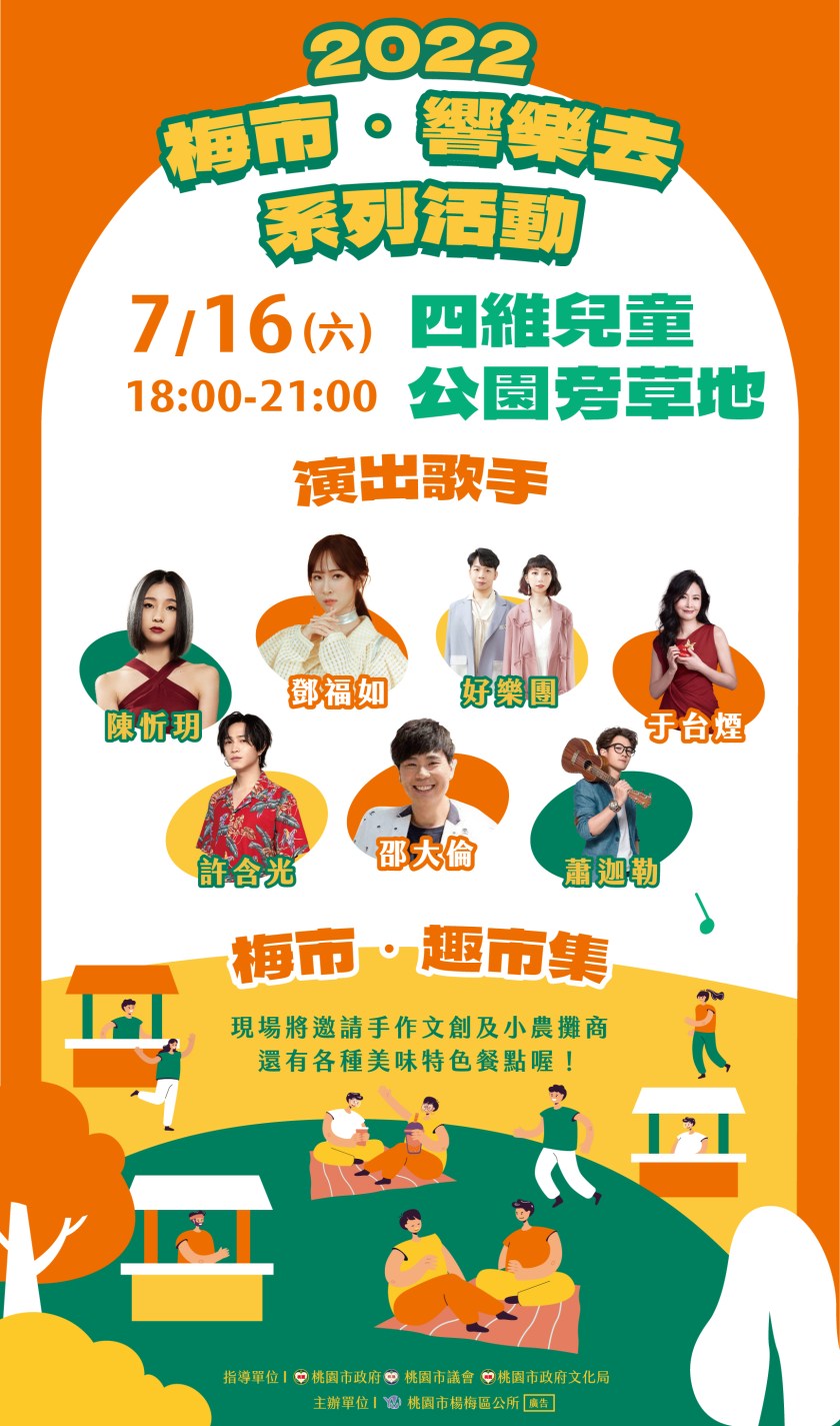 炎炎夏日即將到來,桃園市楊梅區公所為了延續111年元旦升旗典禮暨健走活動的效益,將於7/16(六)下午6時於楊梅四維兒童公園旁草地辦理「2022梅市.響樂去系列活動」,現場有知名歌手演出、超值集點活動、野餐風格特色布置、亦有小農文創市集展售,邀請民眾在仲夏夜饗涼風聽音樂,來參加一場充滿文藝氣息的草地市集音樂會!