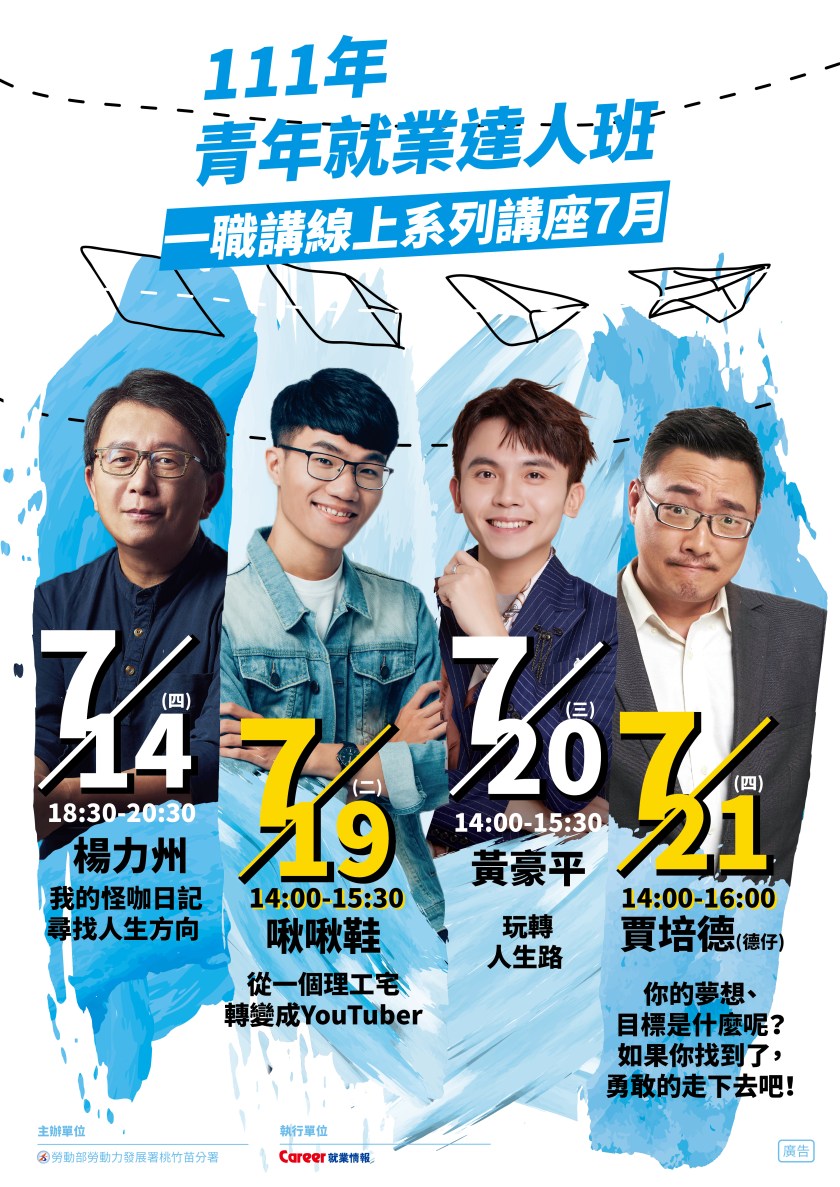 桃竹苗分署長林淑媛表示,因應畢業求職季到來,分署規劃『一職講』系列職涯講座,邀請不同領域發光發熱的成功人士,與即將邁入職場的新鮮人分享不同職業的入行條件及如何適應職場生活,協助青年朋友順利找到適合的工作,7月份講座除了邀請楊力州導演,還邀請啾啾鞋、黃豪平及賈培德與青年朋友談職涯,8月及9月講座也歡迎青年上桃竹苗分署官網(https://thmr.wda.gov.tw/)最新消息查詢。