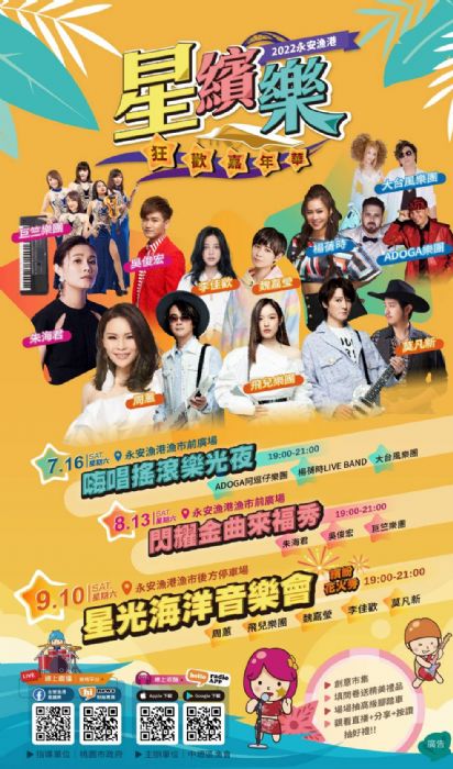 2022永安漁港星繽樂狂歡嘉年華系列活動包含:7/16(六) 嗨唱搖滾樂光夜-ADOGA阿逗仔樂團、楊蒨時LIVE BAND、大台風樂團、8/13(六) 閃耀金曲來福秀-朱海君、吳俊宏、巨筑樂團、9/10(六)星光海洋音樂會-周蕙、飛兒樂團、魏嘉瑩、李佳歡、莫凡新。