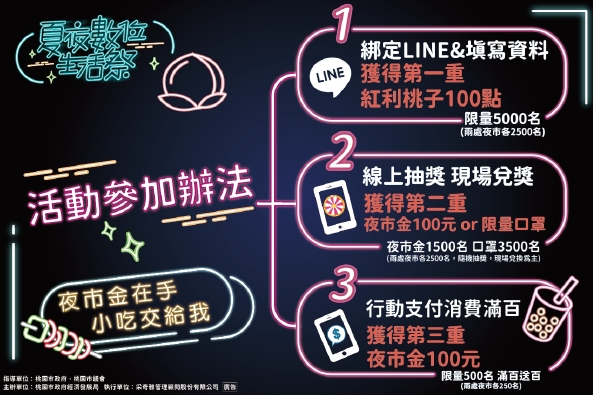 經濟發展局郭裕信局長表示,桃園觀光夜市一直是觀光客來桃園時必逛、必吃的美食天地,也是不少桃園人成長的共同回憶,今年『夏夜數位生活祭』系列活動第一站規劃在桃園觀光夜市,就是希望民眾能重新回到好久沒逛的老夜市,感受疫後市集新活力,現場提供三重優惠活動;第一重:民眾只要於活動時間前往活動夜市現場,以智慧型手機登錄LINE帳號資料,就能獲得100點紅利桃子點數之兌換資格(限量5,000名)。第二重:登錄資料後進行數位抽獎,就有機會抽中100元夜市金或活動紀念口罩(限量5,000名);第三重:民眾於桃園夜市活動櫃台出示行動支付消費紀錄(不限支付系統),滿百再送百元夜市金(限量500名),歡迎大家作夥來桃園逗鬧熱!